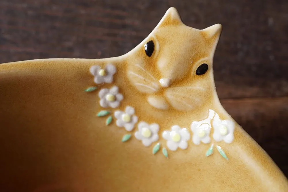 This unique flat squirrel bowl features a design where the handle resembles the squirrel's face, while the bowl itself mimics the body. The tail design on the bowl and the stylish flower necklace around its neck are standout highlights!